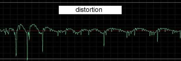 Un problema con este sistema es que en cada paso hay una función de transferencia no lineal, es decir, hay una distorsión que se produce porque los cambios de brillo no siempre son proporcionales al cambio de voltaje aplicado. Ver la imagen abajo para obtener un ejemplo y escuchar la muestra de audio adjuntada.