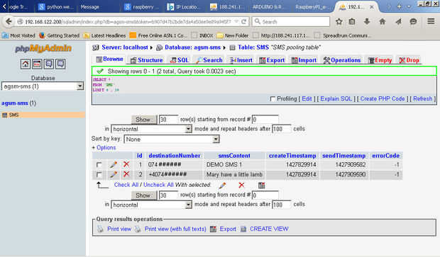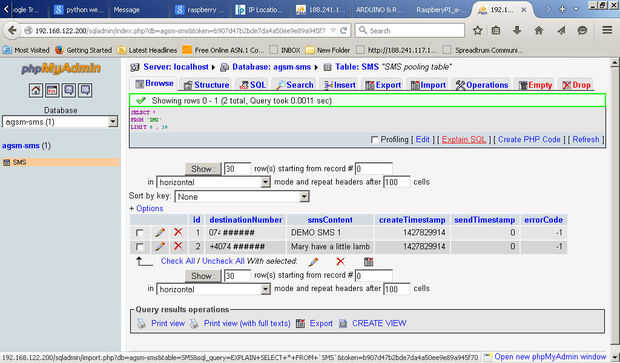 Consulte la tabla SMS para ver la SMS(s) insertado previamente, como en la primera foto.