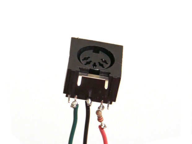 Siguiendo el esquema anterior, suelde una resistencia de 220 Ohm al pin MIDI 4. Conectar toma de tierra pin MIDI 2 y 5V al pin 5 de MIDI. Si la numeración de los pines es clara, consulte las fotos de arriba.