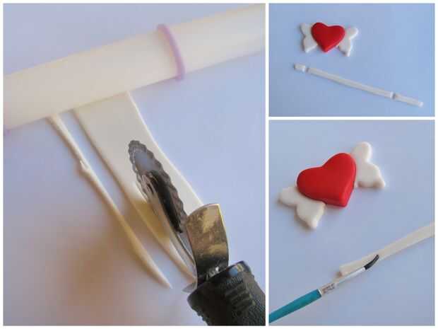 Extienda algunos (fondant) blanco y utilizar el cortador de mariposa para golpear hacia fuera la forma de utilizar como alas. Con la espátula, cortar la forma de la mariposa por la mitad y las dos mitades del espacio para que contorno el corazón. Recorte la parte sobrante con el cortador de forma de corazón. Cepillo de agua en las alas y adjuntarlos al corazón rojo y deje que se seque.