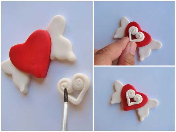 Coloque el corazón alado cepillado agua hacia atrás y colocando en el centro del corazón rojo.