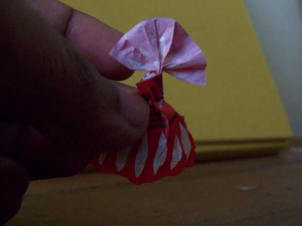 se necesita candy wrappers. Envolturas de Starburst son el tamaño perfecto, igual que ahora y más tardías envolturas. Necesita mucho si usted quiere hacer una larga cadena.Paso 1: Doblar la envoltura por la mitadPaso 2: Doblar por la mitad otra vezPa