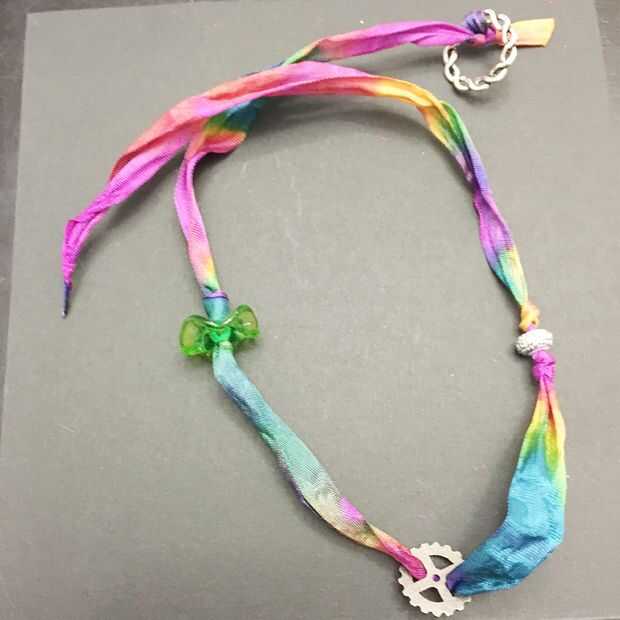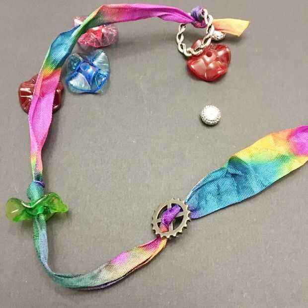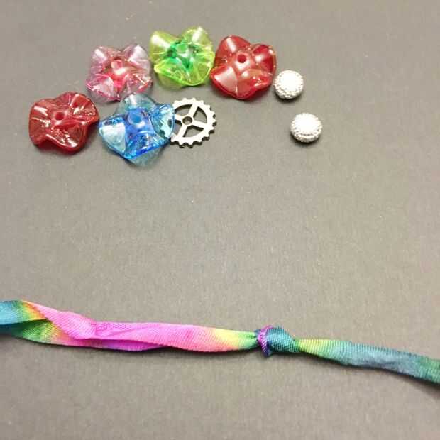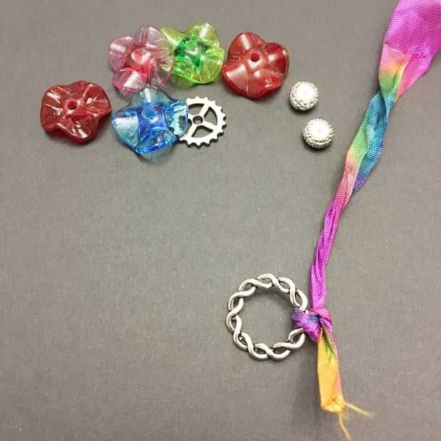 Cuando la cinta esté seca puedes empezar añadiendo adornos y cierres. Aquí tengo una gran variedad de abalorios de Murano hecho a mano, abalorios espaciador, engranajes y un cierre de aro de plata tibetana trenzado.