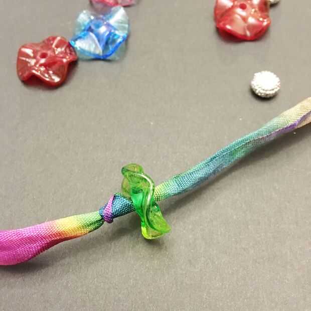 Tome un extremo de la cinta y atarla al cierre (tal vez agregue un poco de pegamento entre nudos de seguridad). Luego añadir un nudo unas pocas pulgadas de distancia y deslice una tira (dependiendo de cuán grande son los agujeros de sus cuentas, puede que no necesite los nudos). Seguir haciendo esto hasta que estés satisfecho con la mirada.