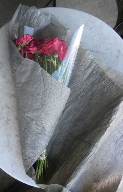 Tanta opción, pero cuando ranunculi son $5 o bajo la regla es: tienes que comprarlos. Y la encantadora niña de las flores dice que sí por supuesto puede usar mi abrigo. Sólo se necesita un poco de cinta adhesiva para cerrar. Estoy muy contento con él.