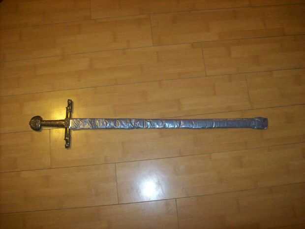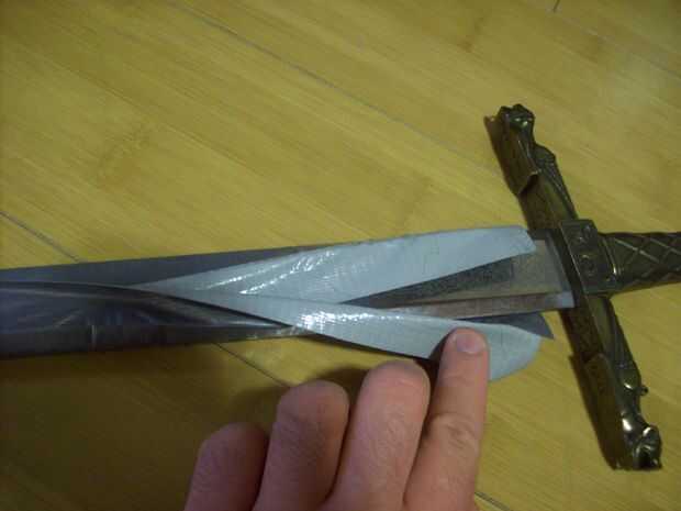 En mi caso utilicé cuatro pedazos de cinta adhesiva. Si estás usando una espada más pequeña, o una espada de esgrima puede utilizar tiras medio cortadas longitud sabio.