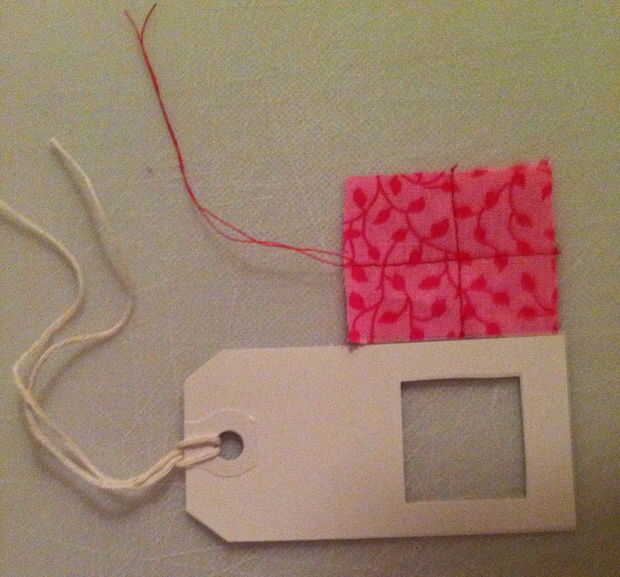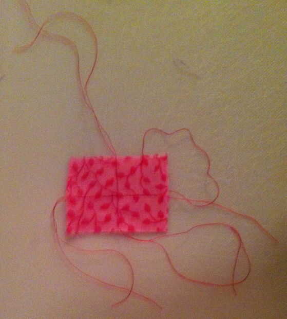 Con los lados equivocados de la tela junto, coser una línea recta vertical y horizontalmente.  Dejé los extremos del hilo de rosca de largo para atar nudos para evitar que cualquier partes descocidas.  Sólo el nudo y cortar los tres lados del cuadrado de tela.