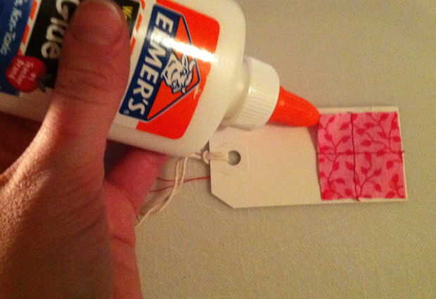 Pegar con cuidado la tela cuadrada a la etiqueta alrededor de los bordes en el lado opuesto del hilo de rosca.