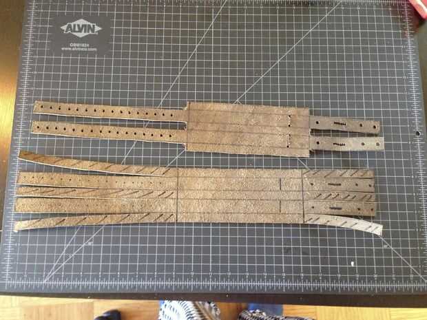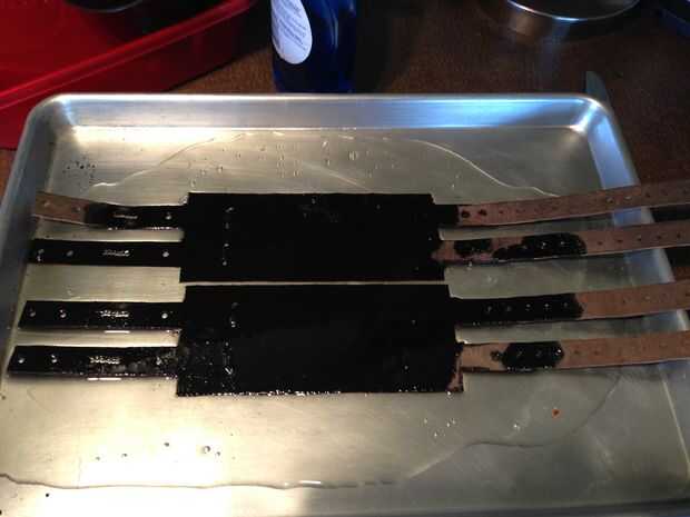 Una vez que el cuero es recortado y perforado, puede ablandarla calentándola y empapar en aceite. Poner el cuero sobre una hoja de galleta cubierto en aceite y ponerlas en el horno a ~ 200F por una media hora. Lavar con detergente y secar antes de instalar el hardware.
