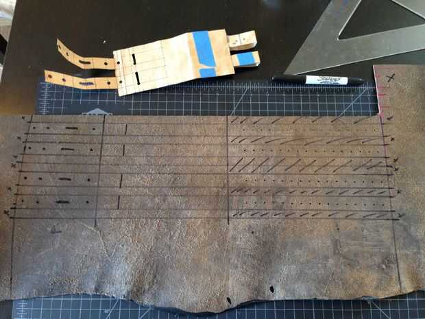 Si la redacción de su propio patrón, primero Marque un rectángulo de 6 "X 18". A través de las líneas de marca de dimensión más corta en 4, 5.5 y 11,5 pulgadas. A lo largo de las líneas de marca de larga dimensión a.5, 1.25, 1.75, 2.5, 3, 3.5, 4.25, 4.75 y 5.5 pulgadas. En el lado de la hebilla, marque los orificios en.25, 1 y 3.5 pulgadas y una ranura para la púa de la hebilla de 2-2.5 pulgadas. En los orificios tanga laterales marca cada media pulgada.
