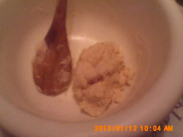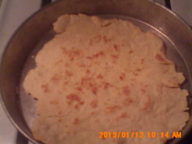 Poner la masa aplanada en la sartén. Calor durante un minuto o menos.