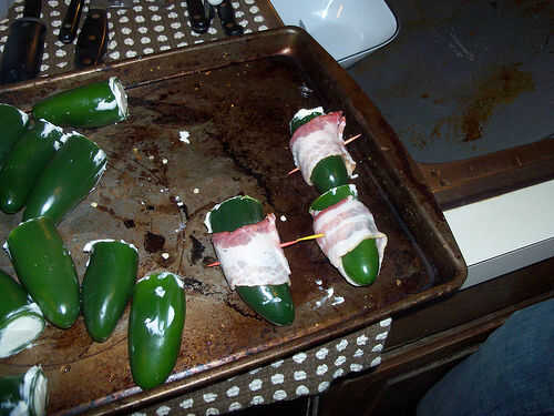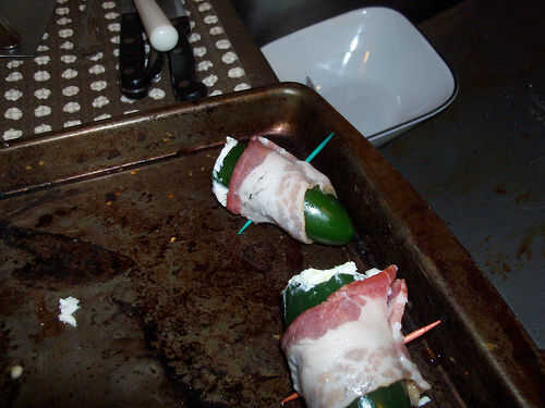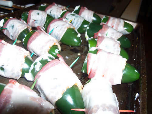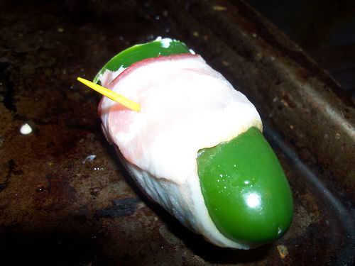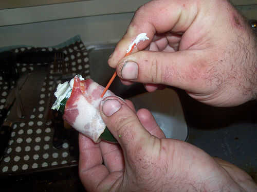 Envuelva alrededor de los pimientos rellenos y apuñalar con un palillo para sostener este tocino envuelto Gloria juntos.