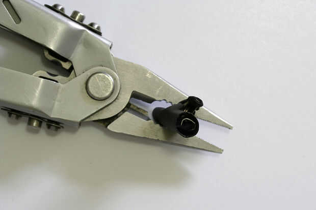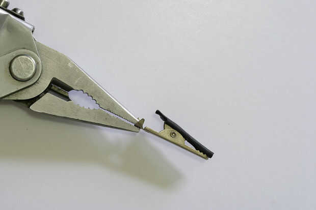 Yo uso una pequeña pinza que pretende para la electrónica. Para que se vea bonito y para mantener sus dientes metálicos de morder en la tela de la camisa, cortar un trozo de tubo termo retráctil para la parte superior de la mitad. Hacer 3 cortes en forma de una 'H' se deslice en su lugar, cubriendo la mandíbula y mango. El corte de 'H' es tan alto como el clip es amplia y tan amplia como el área de la bisagra es larga. He añadido una ilustración primitivos.
