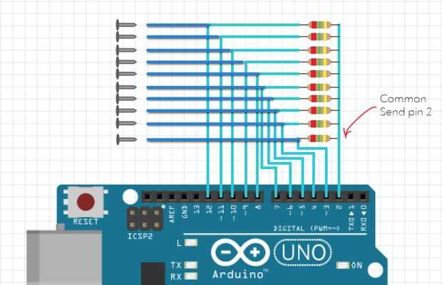 En el segundo diagrama, verá cómo conectado múltiples sensores con arduino, todo uso pin 2 como el común enviar pin y luego fije a otro pin digital a través de un resistor.