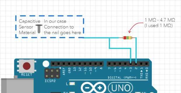 En el primer diagrama vemos cómo configurar un circuito básico de detección capacitivo. Pin 2 es nuestra común pin enviar y pin tres es nuestra primera nota, conectamos estos dos pines con una resistencia de entre y luego coloque el clavo a la conexión entre la resistencia y la entrada a la clavija 3.
