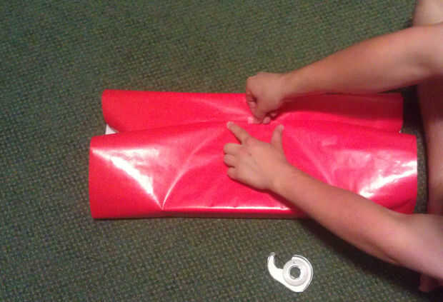2. tomar el rollo de papel de regalo y dóblela sobre el otro lado de la caja para que ninguno de la caja de muestra. Cortar el rollo a lo largo de esta línea y el extremo suelto de la envoltura de la caja de la cinta. No podrá ver cualquiera de la caja ahora.