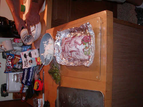 Esta es una fotografía del producto terminado. Es mi esposo que está apuntando a su nuevo "Slap Chop" que quería tan mal y con prontitud se rompió.
