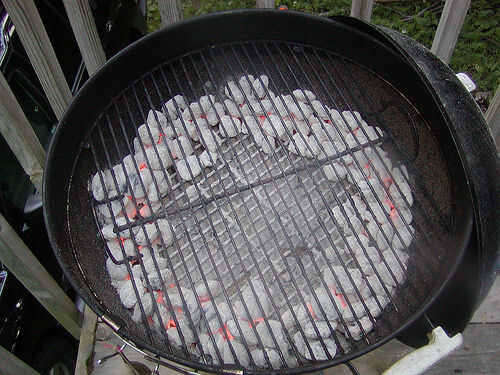 Luz carbones y cuando caliente, empuja hacia el exterior.  Grasos se cocinan en medio de la parrilla.  Si usa una parrilla de gas, apague el Jiao Medio y cocinar la carne sobre el Jiao Medio.
