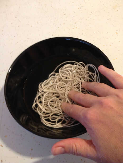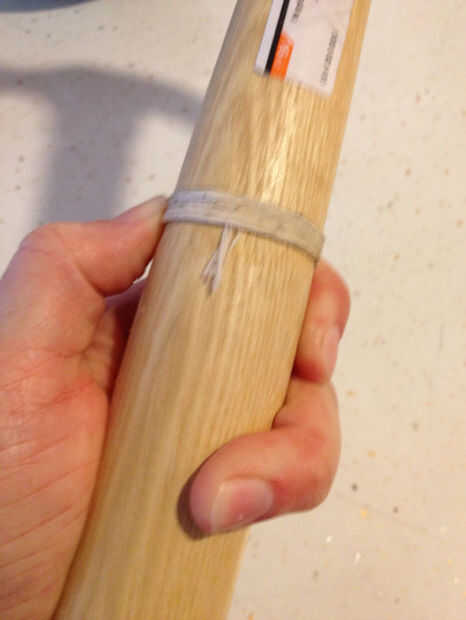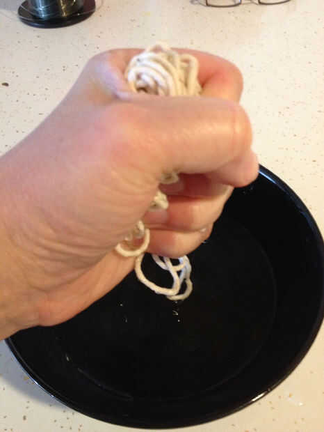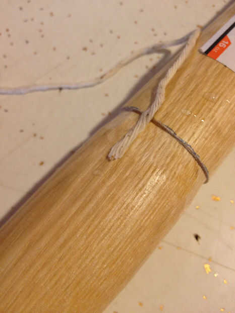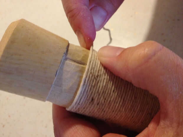 Envuelve todo el asunto una vez para ver cuánto cadena necesitaría. Corte mucho más cantidad de tampón y había empapado por un tiempo. En general, que una fibra natural estirará cuando moje y encogimiento como se seca, y quería el abrigo tan estrecha como podría conseguirlo. Después de unos minutos de remojo me había sacado hacia fuera de la cadena y comencé envoltura. Empecé poniendo 3/4" o la cadena a lo largo de la ranura vertical había hecho, hizo un ángulo recto y comenzó a envolver sobre él. Tiró firmemente como fui y después de dos vueltas no tuve que sujete el extremo más. Cada cuantas vueltas presioné la envoltura junto con mis miniaturas. Yo envueltos hasta el inicio de la segunda muesca longitudinal en el extremo de la palanca.