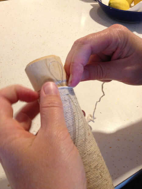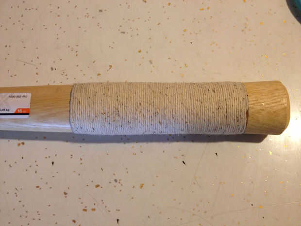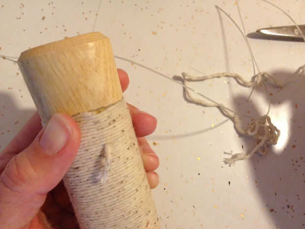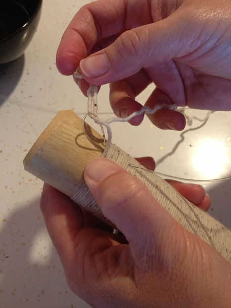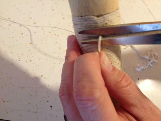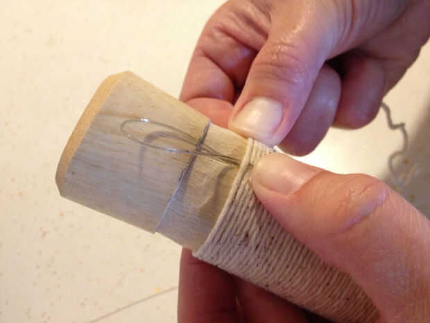 Mientras sostiene la cuerda apretada, hace un loop de monofilamento de nylon y lo colocó en la ranura vertical, con el lazo que se pega hacia el final del mango. Luego continué envoltura, sobre la parte superior del lazo de monofilamento, hasta que llegué como pude. La última vuelta tuvo moviendo un poco para entrar en el lugar, que es bueno, ya que significaba que era agradable y apretado. Relleno el extremo de la cuerda a través del loop de monofilamento y cortarlo corto, dejando aproximadamente una pulgada y un poco de cola. Me aseguré que la cadena tenía algunos dan a ambos lados del bucle, así que tiraría más fácilmente. Sacó los extremos de monofilamento entre las vueltas de la cuerda y al final de la cadena fue enterrado debajo de las vueltas anteriores. Tomó un poco de un tirón para lograrlo. Finalmente cortó el final de la cadena - tuve que coinciden con un cuchillo porque tijeras eran demasiado gruesos para obtener un recorte muy cercano, no sé por qué no simplemente usar el cuchillo al principio.