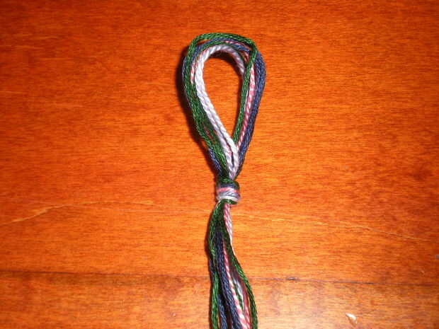 una pulsera bastante sencillo que sólo requiere 1 nudo.  Utilicé 4 colores (1 azul, rojo 2, naranja 3, amarillo 4) pero se puede elegir en cualquier lugar entre 3-8 colores.Materiales que necesitas:-Cadena (a veces llamada seda en tiendas de artesaní