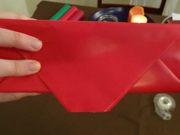 El papel en la parte superior debe estar apuntando hacia la parte inferior del presente. Doble el papel de abajo bien abajo, tirando firmemente contra la caja de regalo.