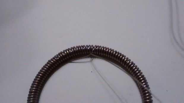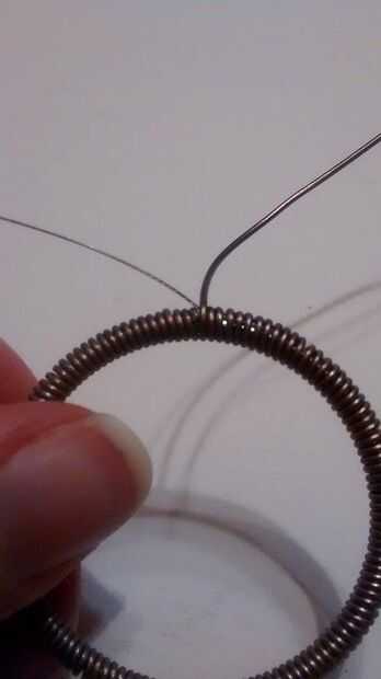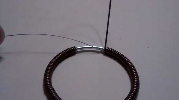 Luego se necesita un trozo de alambre de abalorios del mismo tamaño que usted empezó con antes de. Mientras los brazos están separados. Este tiempo puede cortar el alambre del carrete. Como se puede ver en la imagen, coloque el cable de abalorios a lo largo de la anilla de metal y continúa envolviendo el alambre de aluminio hasta el anillo del metal esté completamente en cerrada. Cuando termine, debe sobresale el alambre de abalorios. Ahora puede utilizar el cortaúñas para cortar la cola de alambre de aluminio.