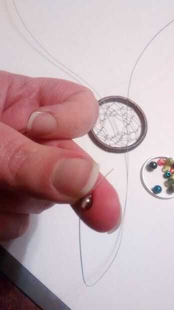 Tiempo de agregar bolas! Granos de la semilla funcionan muy bien para esto, pero usted puede comprar las piedras si quieres. Sólo asegúrese de que es algo lo suficientemente pequeño como para caber su colgante. Ahora sólo cadena el grano en el alambre de abalorios y continúan sus nudos. Trato de hacerlo en un lugar que tiene un espacio pequeño nudo así puedo saltarlo. Esto también ayuda con espaciado desde la próxima ronda de anudar, no podrás poner un nudo donde el grano es y tendrá que saltar al siguiente espacio hay también. Esto se muestra en las fotos de arriba. Si tienes espacio para poner un nudo con el cordón, no duele nada. Es una preferencia en lo creo que se verá mejor.