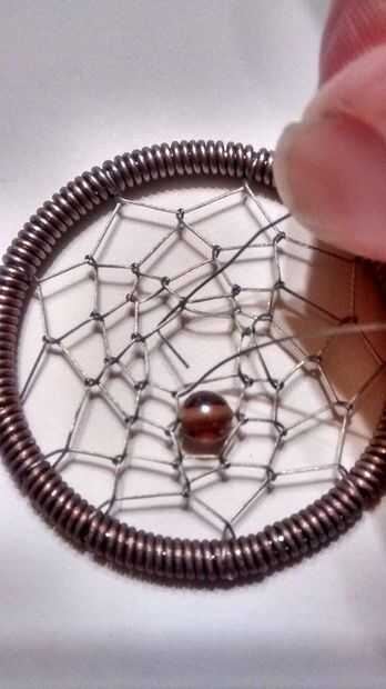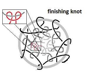 Como llegar al centro, hay algunas opciones sobre cómo conseguir tu alambre de abalorios a través de los agujeros de sus nudos. Me gusta usar mis uñas y poner una curva en el cable para que puedo alimentarla a través de más fácil. Puede también utilizar una aguja o un par o alicates de nariz de aguja, incluso algunas pinzas para ayudar a conseguir a través. No importa lo que su método, esta parte puede ser muy complicada. Al llegar al centro mismo, es hora de atar el nudo. Como estamos usando alambre, siento que un nudo doble invertido es la mejor manera de ir. He tratado de ilustrar esto para usted en la pintura. Hacer la primera mitad del nudo como todo el resto antes de esto, pero antes de que usted Tire firmemente, levante el alambre de abalorios en la parte delantera, detrás el alambre que ata, luego hacia abajo frente a ese mismo cable y detrás el alambre que tiró justo enfrente el primer nudo. Luego páselo todo apretado como sea posible. Una vez que usted siente que el nudo sea seguro y no se deshagan, es hora de cortarla con el cortauñas. TA-Da! Casi ha terminado!