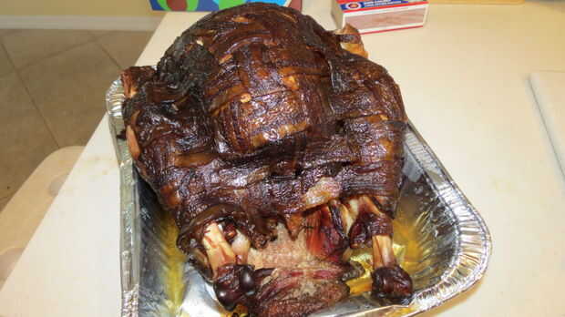 Oh mi Yum! Esto es algo que hacen bastante regularmente. Así de Simple!Paso 1: Prepárese Conseguir un lomo de cerdo (encontré uno que fue previamente marinado en Borbón y jarabe de arce!!! Santa mierda!!!)Colocar varias rodajas de tocino debajo de él