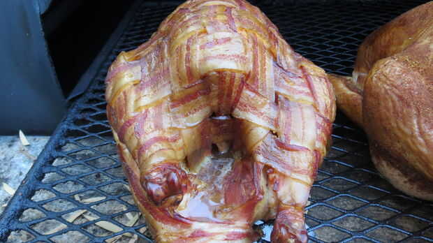 Una vez que el humo está rodando y la tapa está cerrada... NO ABRIR EL FUMADOR! Gracias a la panceta y el lento método de fumar, no hay ninguna razón para hilvanar su pavo, por lo tanto, no hay razón para abrirlo arriba... ni siquiera para echar un vistazo (aunque eso es exactamente lo que hice para el segundo pic ;) Mantenga ese calor interior y sólo agregar más carbón o madera cuando sea necesario. También me gustaría sugerir que si el fumador no tiene una olla de agua, añadir una bandeja de papel pequeña en algún lugar en su ahumador con agua en ella para ayudar a mantener la humedad nivel dentro del ahumador.