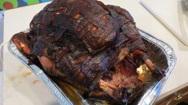 Decido dejar el pavo reposar sobre 15-20 minutos antes de tallado, pero si quería hacer un poco más crujiente el tocino, creo que podría lanzar el pavo en la parrilla por un minuto para crujiente para arriba.