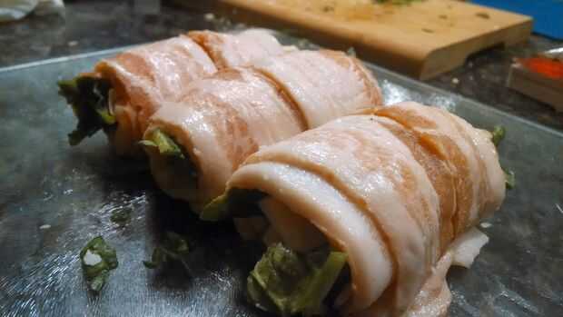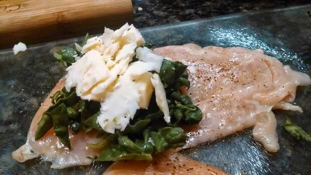 A continuación Coloque 2 cucharadas de mantequilla en sartén y calor en la parte superior de la estufa. Precalentar el horno a 375F. Mientras que la mantequilla se está derritiendo empiezan a preparar el pollo. Pone de 2 pedazos de tocino abajo y una pechuga de pollo. A continuación añadir en una generosa cantidad de espinacas, unos trozos de queso y comenzar a rodar.