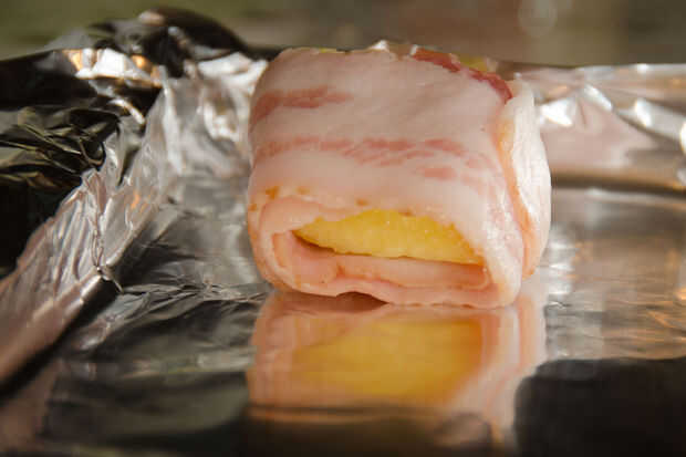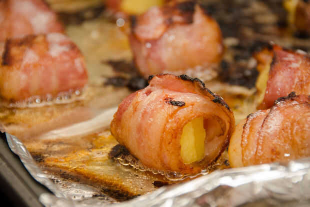 Configurar el horno para asar y cocinar hasta que el tocino ha alcanzado su grado preferido de textura crujiente, girando los trozos de una vez. Me mina a la parrilla durante unos 4 minutos más o menos, entonces volteado todas las piezas y cocina por otros 5 minutos.