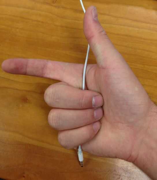 El extremo con el conector debe colgar de la parte inferior de la palma con su poco, el anillo y los dedos medios sobre el alambre. Use su pulgar y dedo índice para hacer la forma de "L".