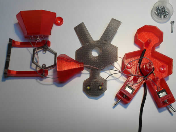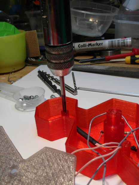 Después había imprimir las piezas, tienes que cortar los hilos. Dependiendo de su impresión, los orificios de rosca en la tapa del caso y la lámpara tienen que taladrar a 2,5 mm. Los LED orificios para los ojos y en la pantalla con 5mm. Para la mejor colocación de lo LED tomé el taladro mm 4,8. Para la perforación cuidado he utilizado un taladro de mano. Taladros eléctricos pueden destruir la impresión de 3 horas en 0,5 seg.