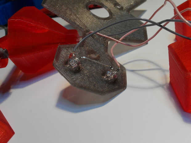Pegar en dos de lo famosos LED en los ojos (en la tapa) y cuatro en la pantalla. Ahora entre la soldadura de las matrices de LED de los ojos y la pantalla y el cableado. Tenga cuidado de la polaridad de los LEDs. Consulte también el esquema y las notas del cuadro.
