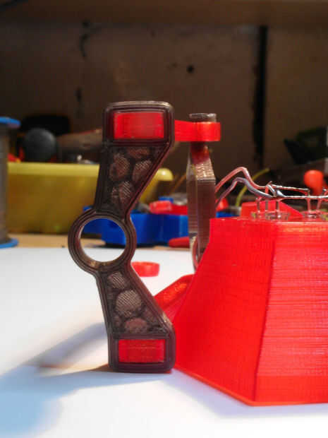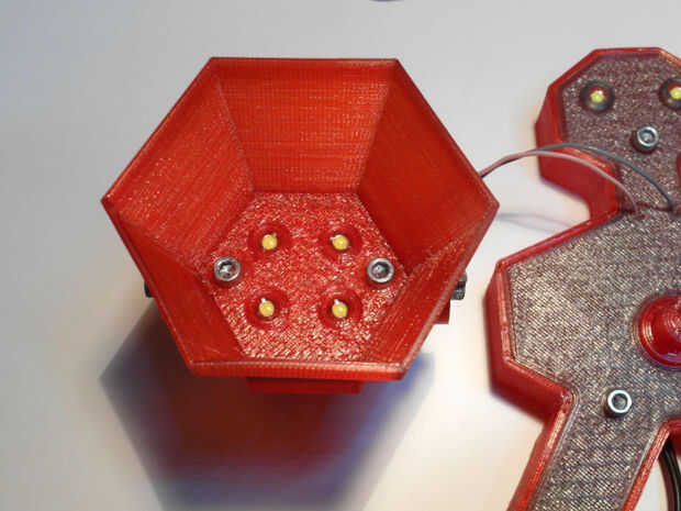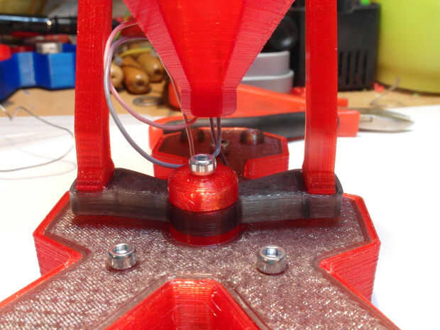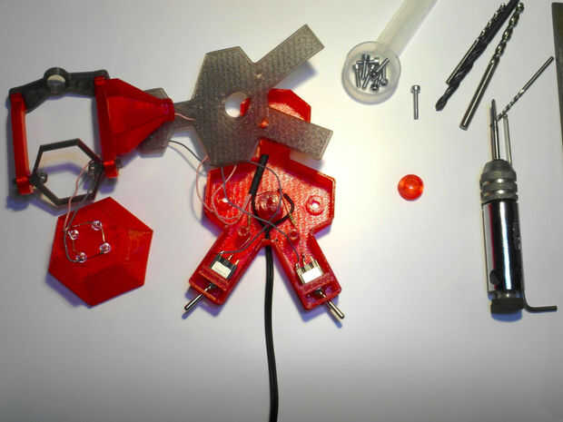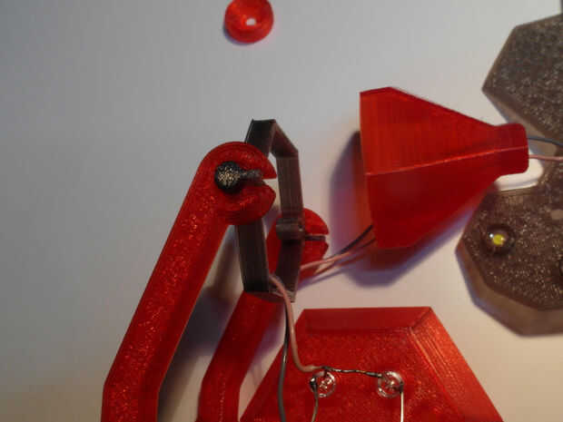 Pegar los brazos en posición en el anillo de desbloqueo. Gire el anillo un poco por lo que va a arreglar. Tenga cuidado, las patillas poco pueden romperse fácil. (El stl contiene un conjunto de dos anillos de seguro) Ahora presione los brazos en el conector hasta que encajen. Los brazos se deberán presentarse al final donde se meten en el conector. Ahora llevar los cables de la pantalla a través del anillo y la tapa y atornille juntos. Si todo parece en la foto cuarta, él ' s tiempo para terminar.