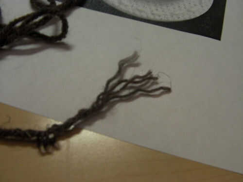 Finalmente, con la boca, tomar el hilo marrón y dividir en subprocesos individuales. Tomar una hebra de hilo. Luego, emparejar a la plantilla transparente, pegamento abajo de la boca.