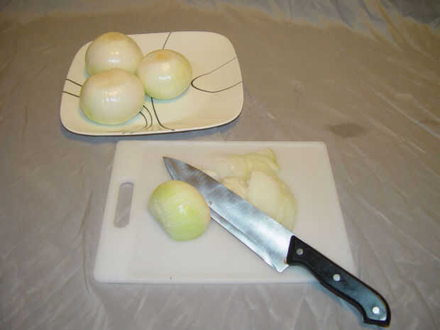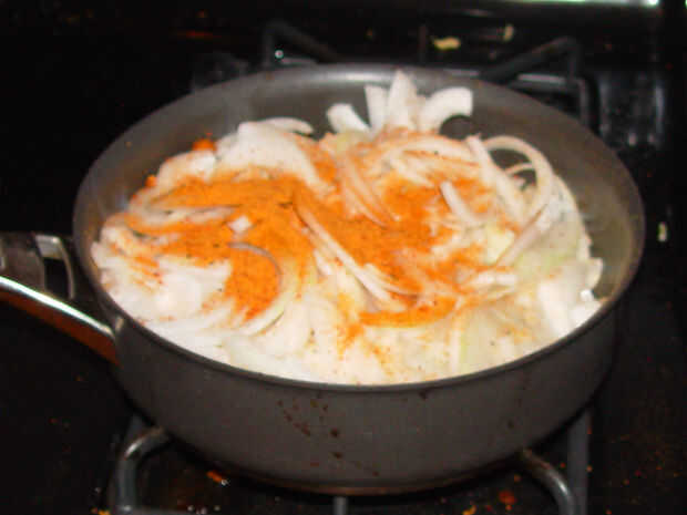 Cebollas blancas grandes picados a rehogar y arrojados en una sartén con un movimiento generoso de tocino sal.