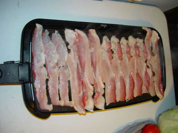 Que encendió la sartén eléctrica y empecé abrasador de libras de las tiras de tocino. (El horno también es apropiado si tienes espacio, desde su ya caliente).
