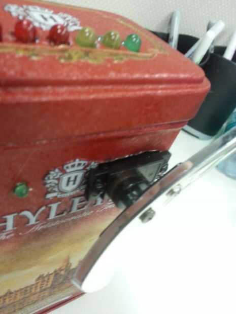 Para el brazo, fue sugerido por mi hermana con una cuchara. Tomé una cuchara de plástico/cromado en la ciudad de fiesta. Quería usar plástico para que fácilmente podía perforar en él y mantener el peso.