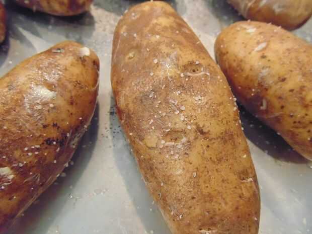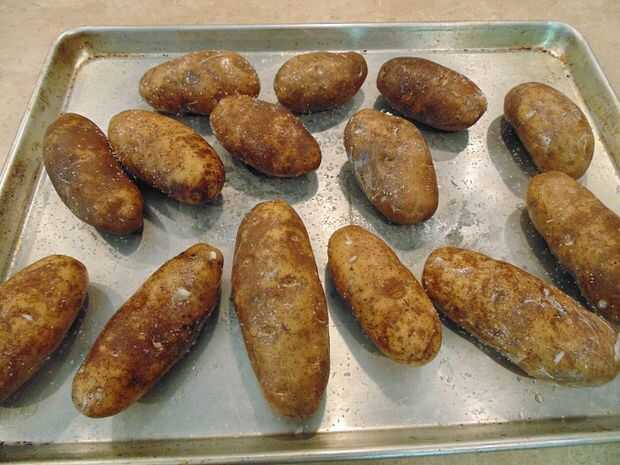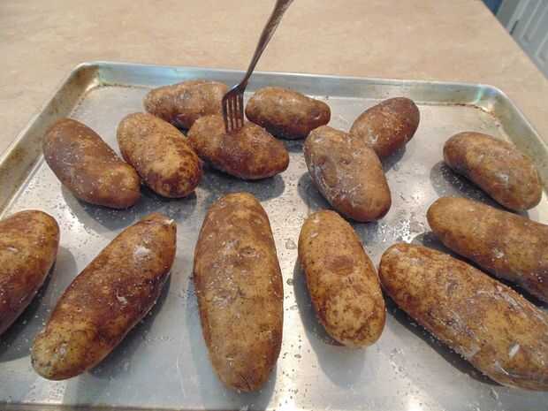 Empujar suavemente los orificios en la piel con un tenedor a lo largo de la parte superior de cada papa.