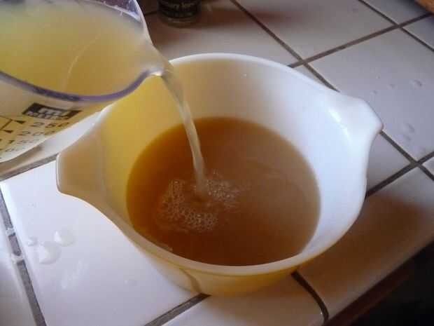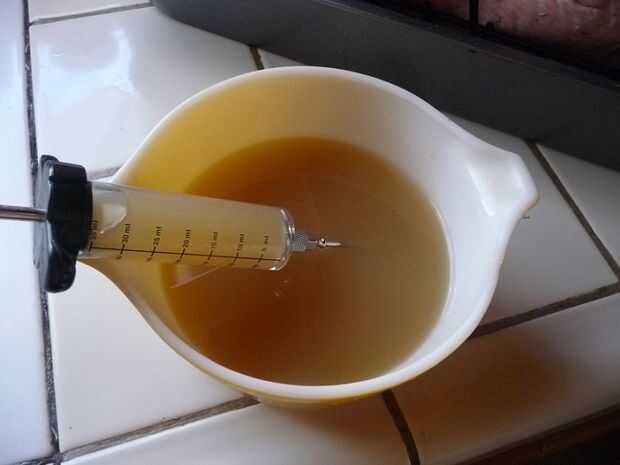 Marinado ingredientes: Mezclar 1 taza de jugo de manzana y 1 taza de caldo de pollo en un bol. Esto es salsa suficiente para un pavo de 20 lb. Es mejor tener demasiado marinada en lugar de demasiado poco. Si usted tiene cualquier adobo extra después de la inyección, póngala a un lado. Usted puede Agregar al jarabe de manzana en el paso 6 de esta receta.