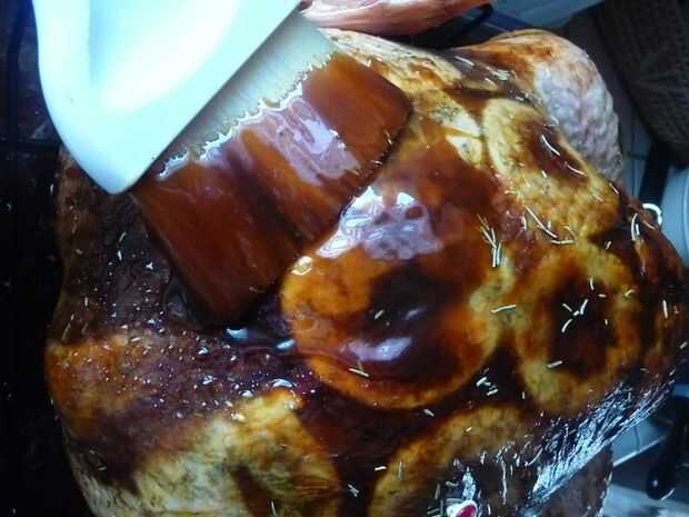 Cuando el pavo está completamente cocido (carne termómetro Lee 165 grados) Retire del horno y pincel en una capa delgada de esmalte final.