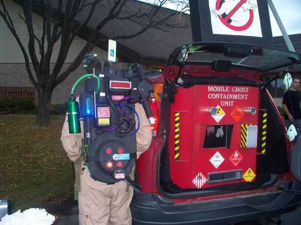 El tronco: Interior estaba envuelto en sábanas negras. Fantasmas de estopilla y juguetes de plástico ciempiés fueron suspendidos del techo bajo luz negra. una máquina de humo bajo también fue utilizada adentro. La "unidad móvil de fantasmas contención" fue hecha de un tablero de Feria de ciencia. También se utilizaron un pañal Limpie la caja, tubos de pvc, pintura y haz etiquetas engomadas.