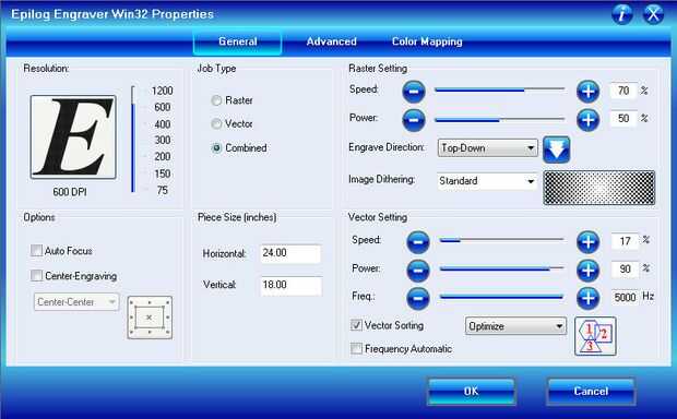 En este tutorial de instrucción la foto voy a explicar todas las propiedades de las propiedades de Win32 de grabador de Epilog. Si tienes acceso a un cortador láser en todos se encontrarán este programa antes de la impresión. Para llegar a las "propiedades" configuración haga clic en "propiedades" al hacer clic en la opción de impresión inicial. Si no vas a esta página de propiedades casi puedo garantizar el corte láser se arruinara. Entender todas las opciones te dará una gran oportunidad de tener el láser corte que quiero!