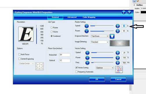 Durante este paso se establece la configuración de la trama. Configuración se determina cómo profundo y oscuro que grabar. Cuando se utiliza madera para conseguir una trama más oscuro más profundo usted haría su velocidad bastante baja mientras que su energía es mayor, y viceversa si quieres una trama más ligera. Cuando rastering acrílico plástico la velocidad no hará una diferencia en el color de la trama, en cambio determinará la profundidad de la trama.