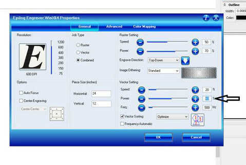 Estos valores determinarán cómo profundo cortará su rayita. Otra vez, la menos velocidad y más energía que usted utiliza, más probable es que cortará todo el camino en el primer corte. Hay que muchos ajustes en línea para los varios materiales de vectores, pero se diferencia según la edad y la potencia de su láser. Sugiero ejecutar unas pruebas para averiguar qué opciones funcionan bien con su material. También tendrá que cambiar su frecuencia dependiendo de su material de contrachapado de abedul vamos 500 hz y de plástico acrílico elegimos 5000 hz. Por supuesto, esto difiere dependiendo del láser y material. También se puede comprobar en línea para otras frecuencias.
