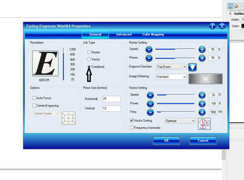 Ahora puede elegir cuál es su tipo de trabajo. Usted puede seleccionar a "Trama" que sólo va a grabar las líneas que son más gruesas que la rayita, "Vector" que sólo cortar todo tu cabello, o "Combinado" que trama y Vector de su diseño.